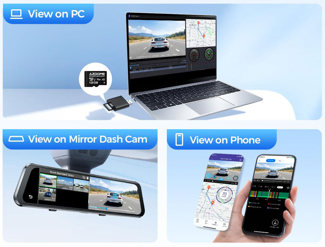 AZDome PG17 Pro Wifi Full Mirror levereras med ett Micro SD-kort på 128 GB. Med detta kan man filma cirka 12 timmar i Full HD. Kameran stöder Micro SD-kort på upp till 256 GB.