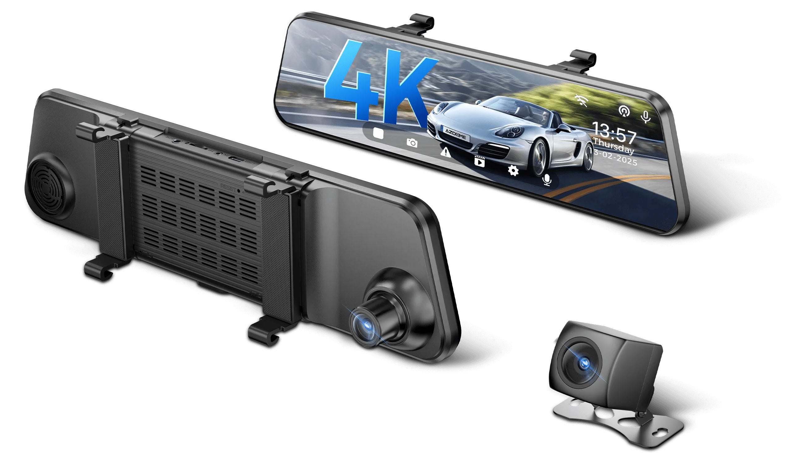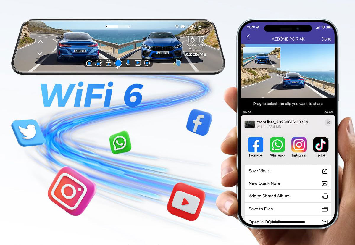 AZDome PG17 Pro Wifi är en unikt utformad 2CH-dashcam som kan placeras över varje innerbackspegel med de medföljande gummibandet. Tack vare sin stora 12-tums pekskärm i LCD-format fungerar den som en högkvalitativ digital innerbackspegel. Den bakre kameran visas fullständigt och mycket tydligt på den stora skärmen, och med ett enda svep på skärmen kan du växla mellan den främre och bakre kameran.