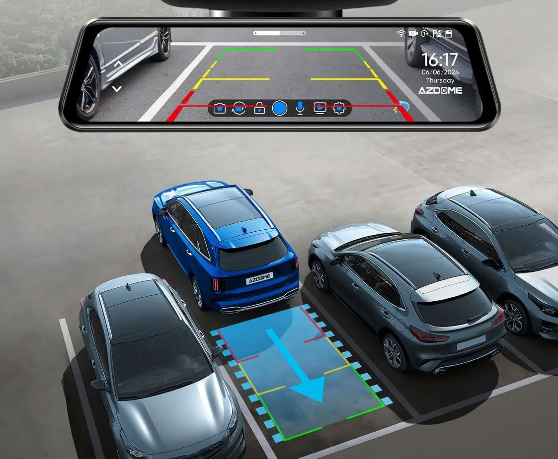 Tack vare sin praktiska design och bakre kamera är AZDome PG17 Pro Wifi också idealisk att använda som parkeringshjälp vid parkering. Den bakre kameran levereras med en extra kabel till strömförsörjningen som kan anslutas till strömförsörjningen för backljuset. När bilen läggs i backläge visas automatiskt den bakre kameran i stor bild tillsammans med parkeringshjälpindikatorer.