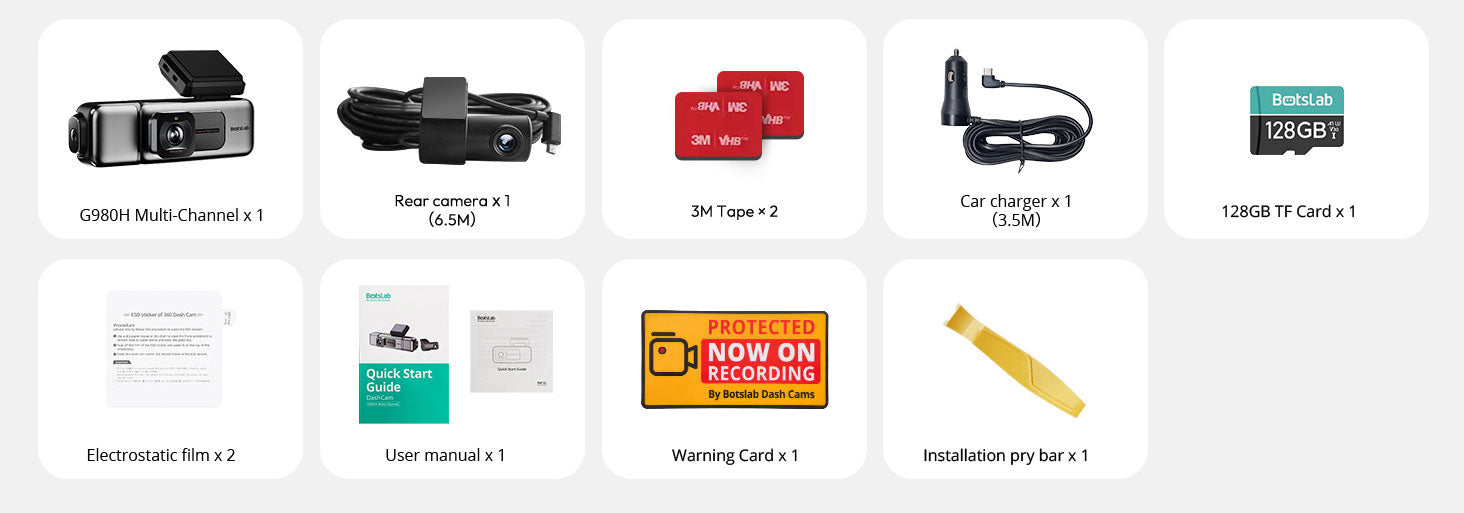 Botslab G980H Pro 3CH levereras med en Full HD-bakre kamera för att även kunna filma bakom bilen. Kameran ansluts till den främre kameran med en 6 meter lång kabel och de spelar in allt samtidigt. När den bakre kameran ansluts justeras upplösningen på den främre kameran till 3K.