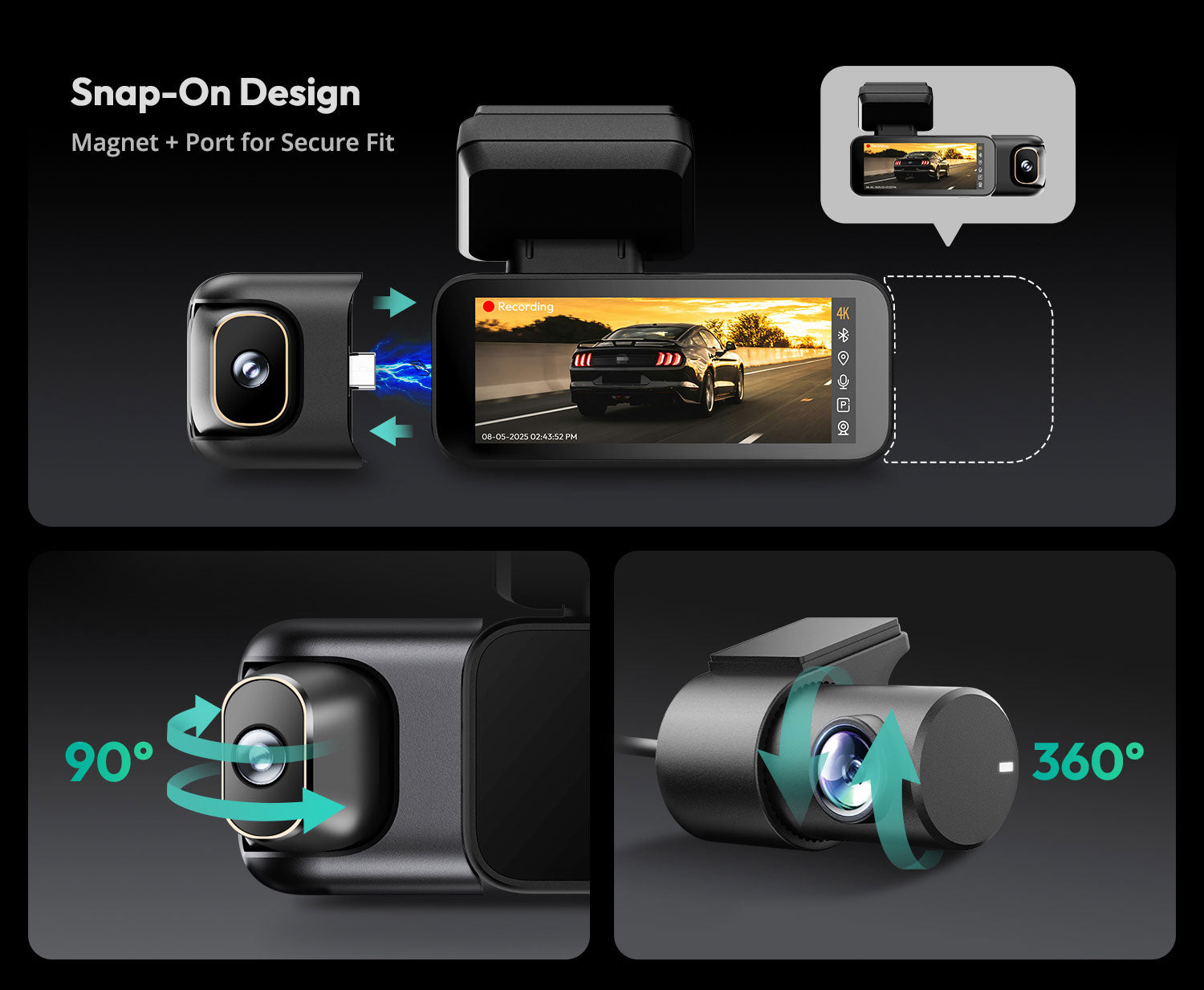 Det unika med denna Botslab G980H Pro 3CH-dashcam är de tre separata kamerorna. Huvudenheten som fästs på vindrutan är utrustad med en 4K-kamera som filmar vägen. På sidan finns en interiörkamera som kan placeras i alla riktningar. Detta gör G980H Pro 3CH till den perfekta dashcamen som parkeringsskydd för din bil.