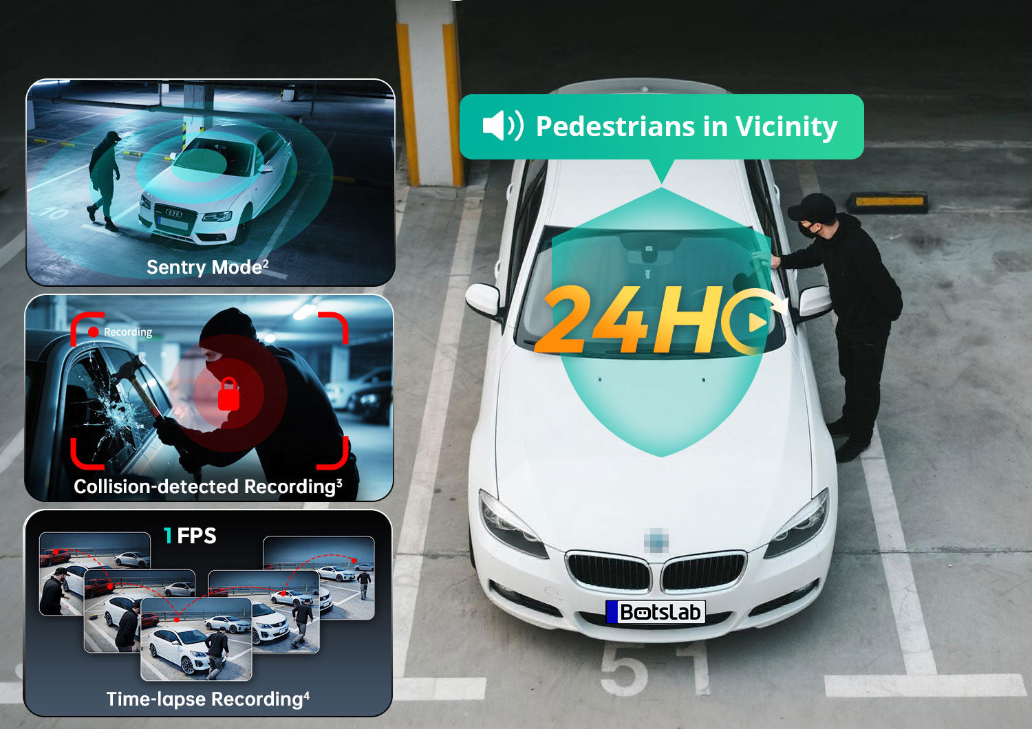 Botslab G980H Pro 3CH har en mycket omfattande automatisk Time Lapse, rörelsedetektering och vibrationsdetektering i parkeringsläge för att skydda bilen under parkering. I Time Lapse-läget tar kameran ett foto varje sekund som senare spelas upp som en 30 fps-video i snabbspolning. Time lapse-inspelningar är något mindre detaljerade och tar därför mindre plats på SD-kortet.