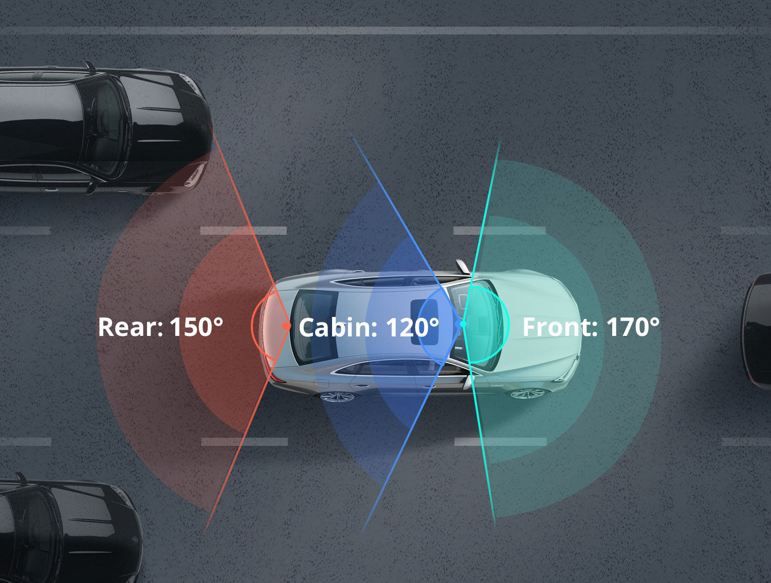 Denna G980H Pro 3CH 4K Wifi GPS har ett vidvinkelobjektiv på 170 grader fram och 150˚ bak. Detta gör att en stor del runt bilen spelas in så att varje situation dokumenteras väl. Sidokamerorna har en betraktningsvinkel på 120˚.