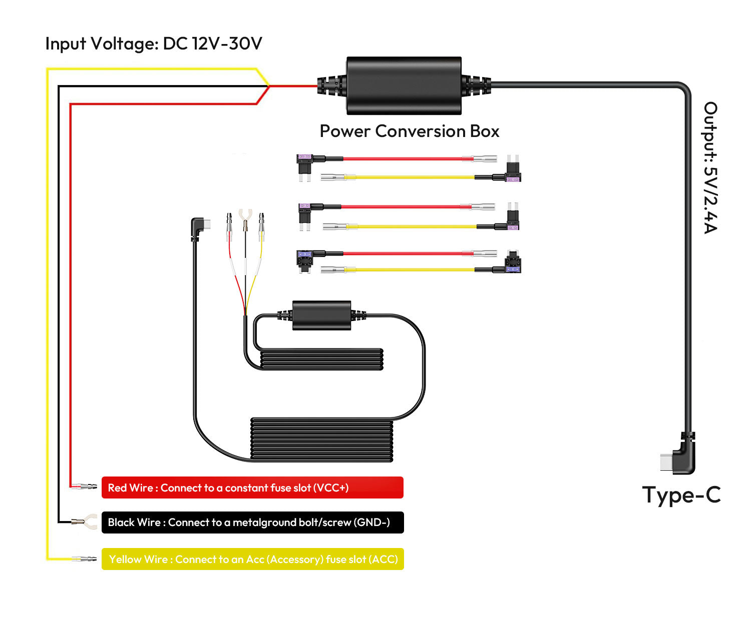 Denna Botslab hardwire kit USB-C 3-wire är en intelligent strömförsörjning för alla Botslab dashcams med USB-C port (HK30 Pro, G500H Pro, G980H Pro, V9H etc.). Denna strömförsörjning kan anslutas till bilens säkringsbox för att driva dashcam när tändningen är avstängd. Botslabs strömförsörjning levereras med alla fyra typer av säkringshållare så installationen är mycket enkel och säker.