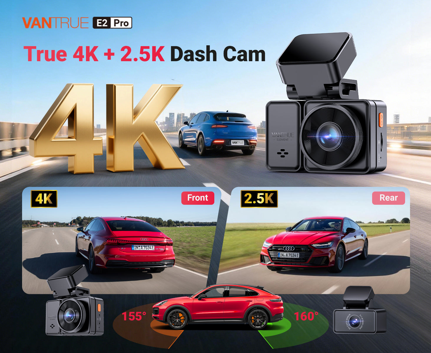Vantrue E2 Pro är en högkvalitativ 4K-dashcam med en 2,5K-bakre kamera och kristallklara nattvisionsinspelningar. Den främre 4K-kameran filmar vägen och den bakre 2,5K-kameran håller ett öga på vad som händer bakom bilen. Vantrue E2 Pro är utrustad med snabb 5 GHz och GPS och kan utökas med en praktisk Bluetooth S.O.S.-knapp för att enkelt göra nödinspelningar.