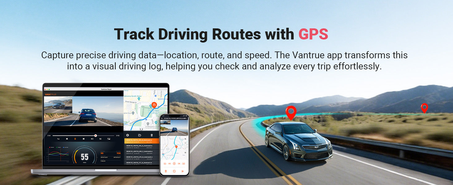 Vantrue E2 Pro är utrustad med GPS så att aktuell hastighet, rutt och plats spåras. Hastigheten kan visas längst ner i varje video om så önskas, och filmplatsen och rutten kan senare visas via appen.
