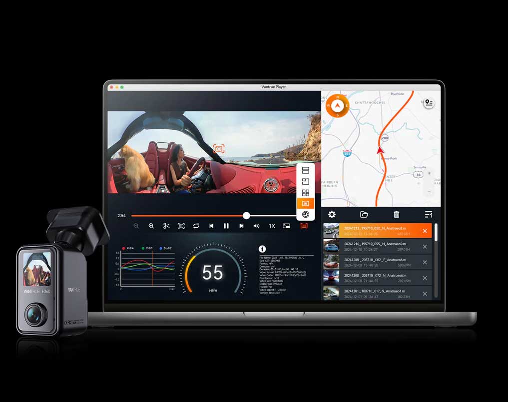 Vantrue E360 Plus är utrustad med GPS så att aktuell hastighet och koordinater registreras. Hastigheten kan visas längst ner i varje video om så önskas, och filmplatsen och rutten kan senare visas via appen.
