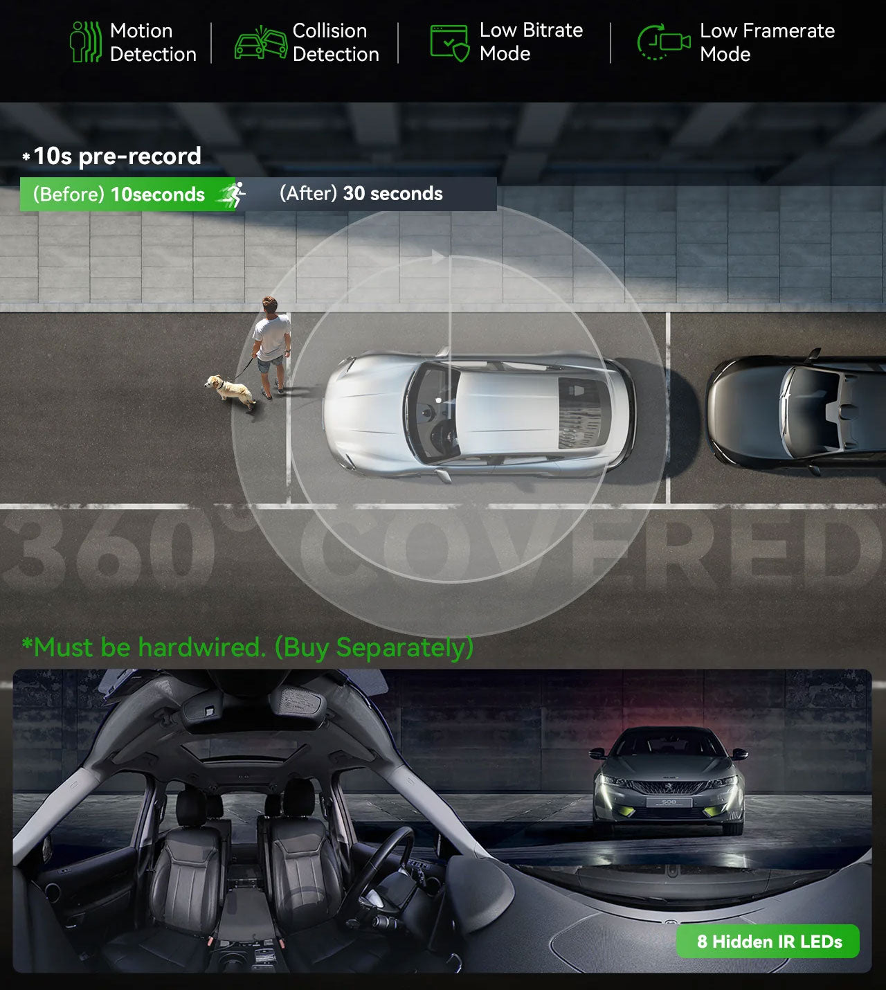 Rörelsedetektering: Rörelsedetektering (med justerbar känslighet) där dashcam är i standby tills en visuell rörelse upptäcks i bilden. Därefter sparas 5 sekunder före och 30 sekunder efter incidenten.