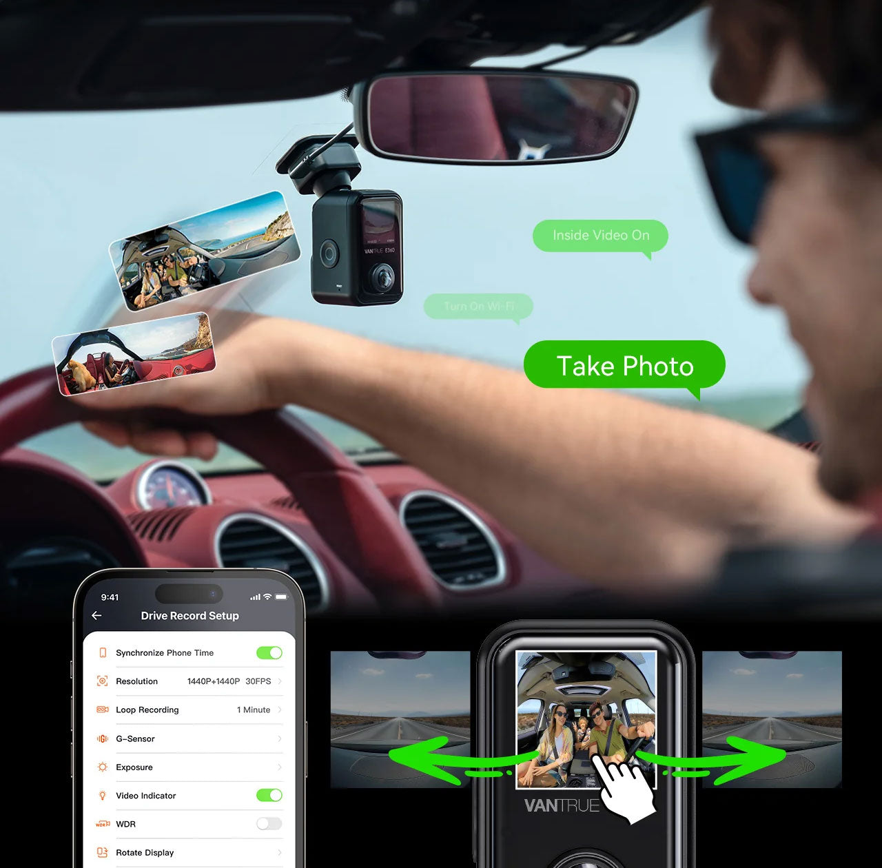 Eftersom Vantrue E360 Plus är utrustad med 3 kameror spelas allt i och runt bilen in. Den främre kameran (155˚), interiörkameran (160˚) och den bakre kameran (165˚) ser tillsammans till att du inte missar något.