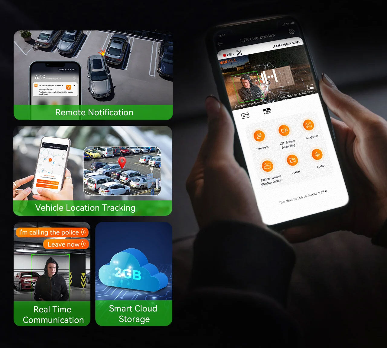 Vantrue Cloud erbjuder dig 2 GB gratis molnlagring för alla videor i parkeringsläge. När molnlagringen är full ersätts automatiskt de äldsta bilderna med nya. Vid speciella händelser (kraftiga vibrationer) skickas också en avisering till din telefon och videon sparas säkert i molnet så att den inte kan raderas automatiskt.