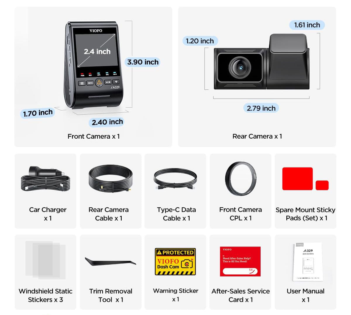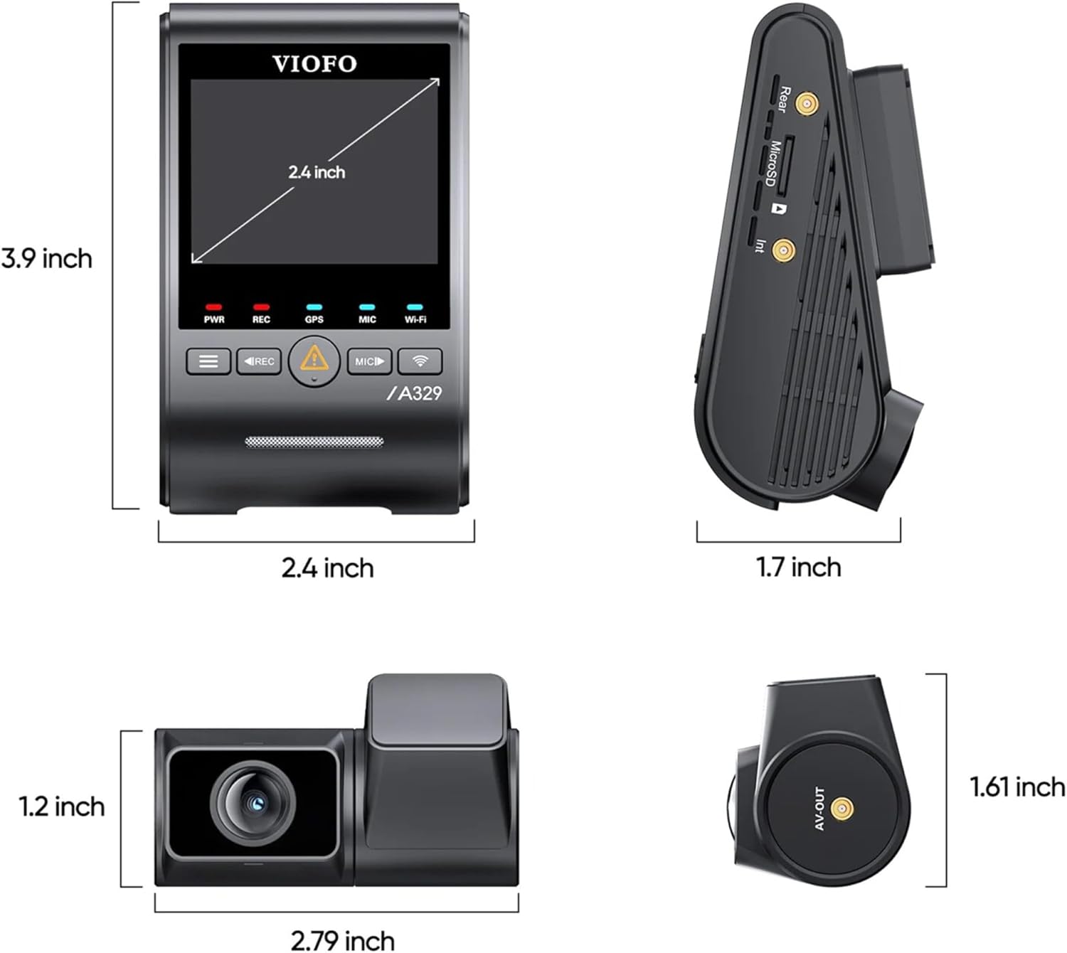 Tack vare det 140˚ + 160˚ vidvinkelobjektivet med fisköga har Viofo A329S 2CH ett stort räckvidd och nästan allt i omgivningen spelas in.